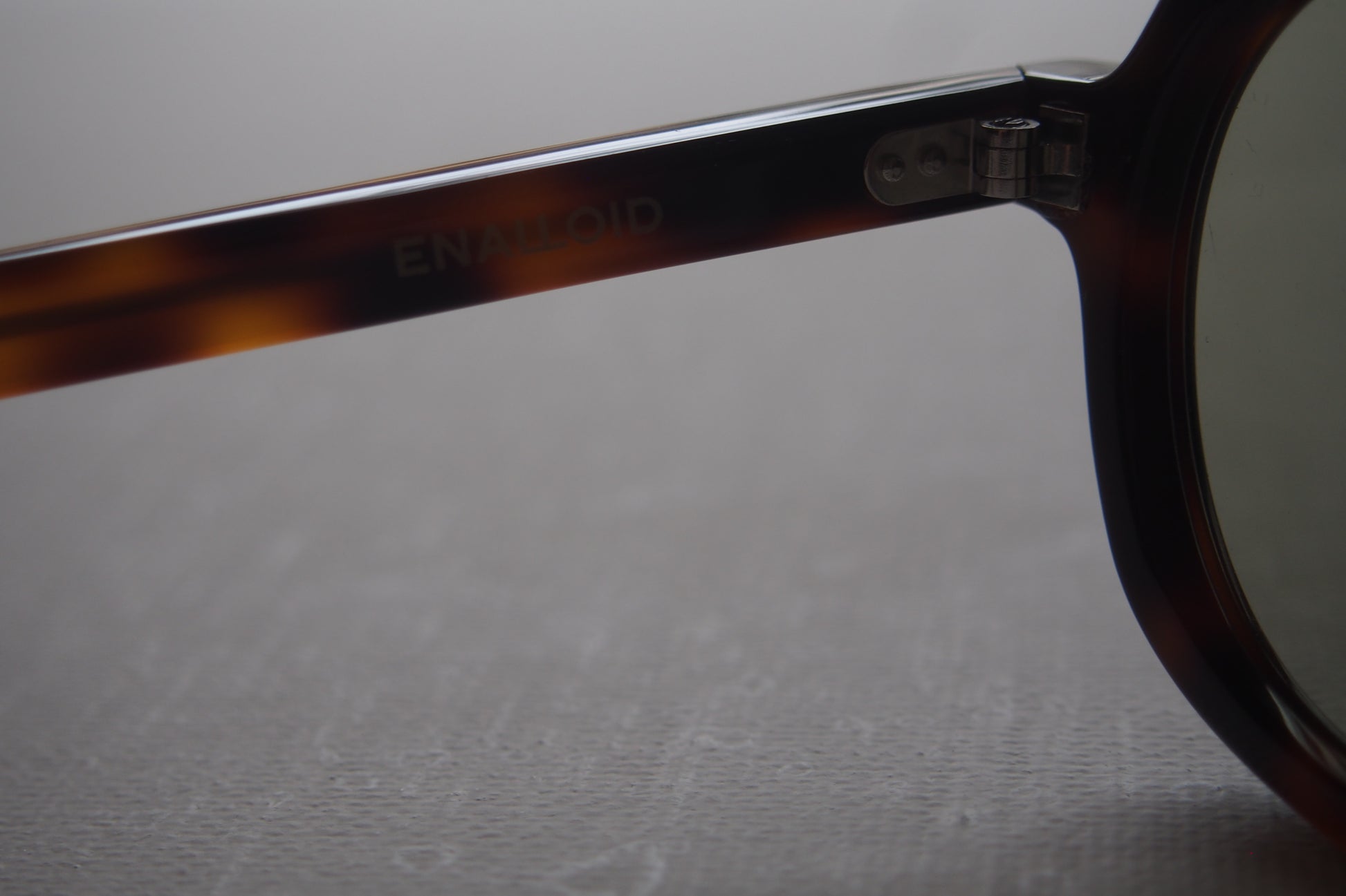 フロントの外枠はカクカクしているのにレンズは楕円ぽくて、それもまた挑発的ですが、どんな人でもかけると意外とサマになってしまうエナロイド特有の馴染みやすさがあります。
