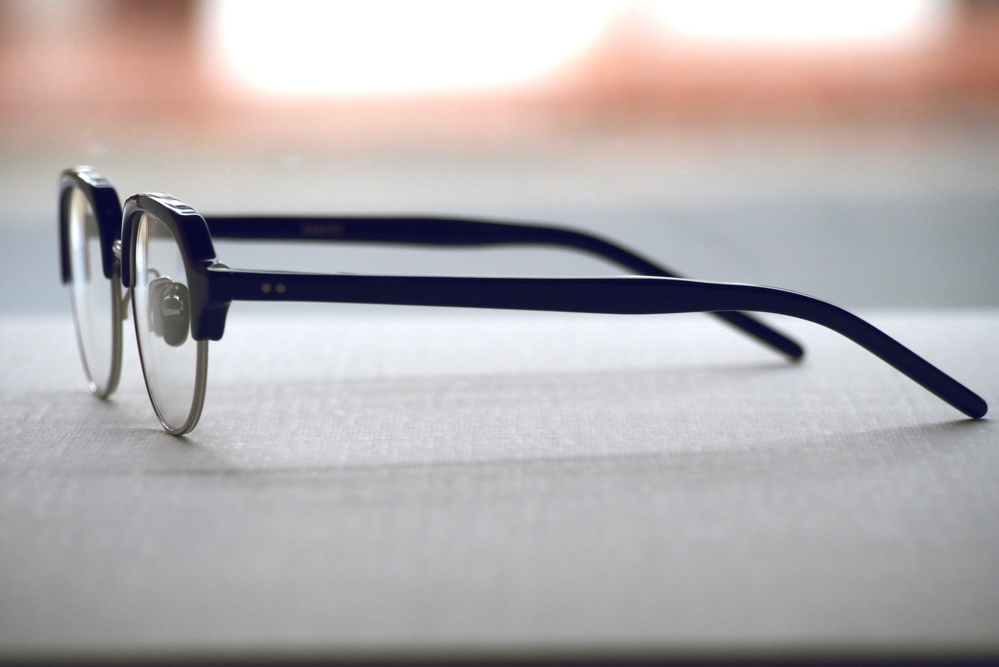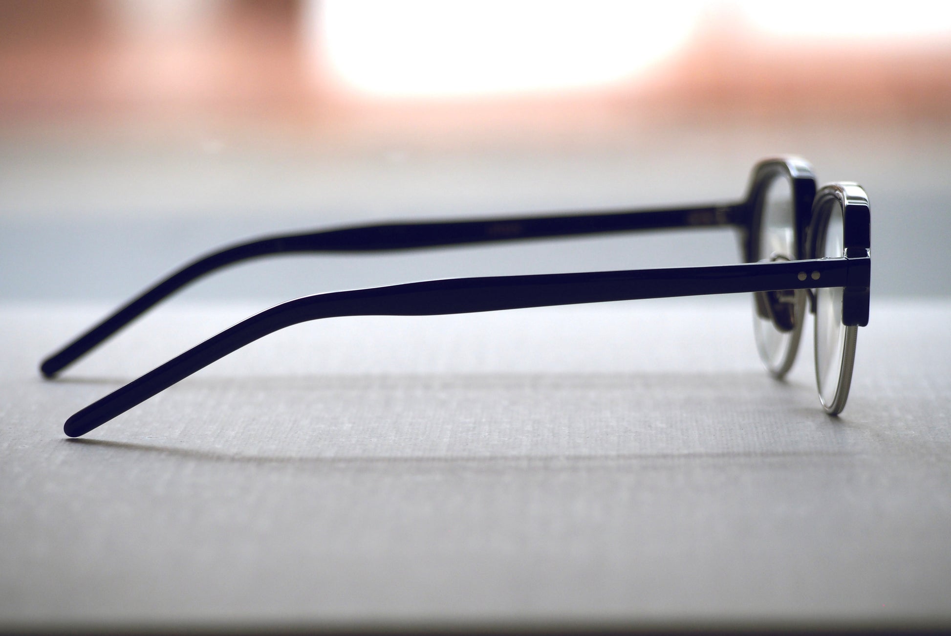 フレームカラーはネイビー。一見ブラックに見えますが、光に当たると美しい濃紺がわかります。デッドストック生地なので再生産の無いカラーとなります。メタルはベーシックなシルバー。