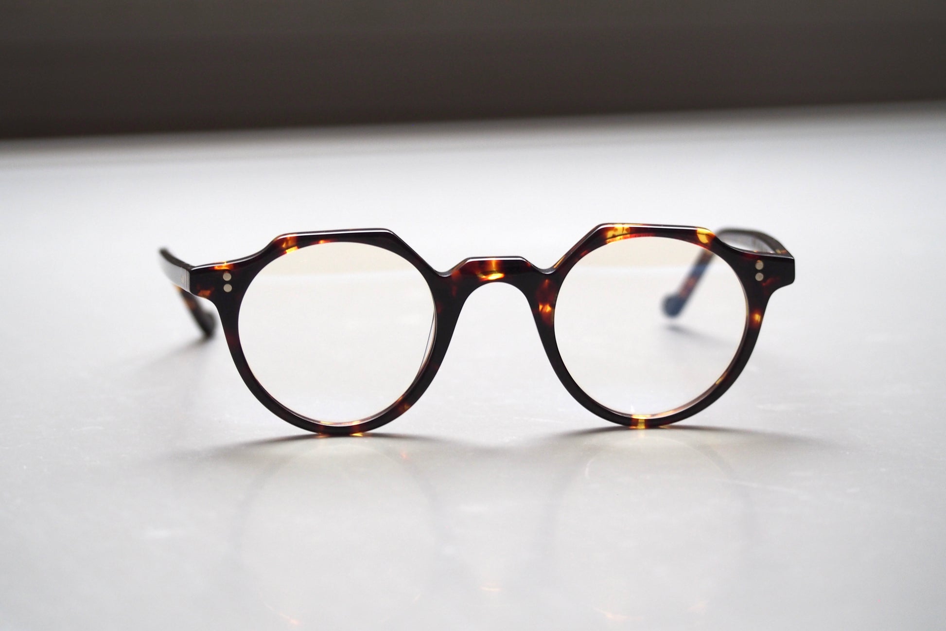 深みのある鼈甲柄でつくられたLesca LunetierのHERIは、フレンチヴィンテージの雰囲気をベースにしながら、スッキリとした細身のシルエットが特徴的なモデルとなります。